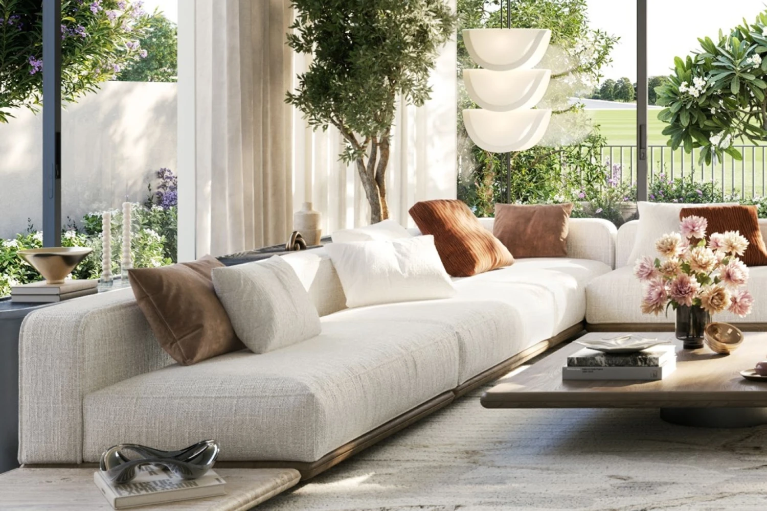 - Earthy interiors with natural textures and flowing layouts for luxury living