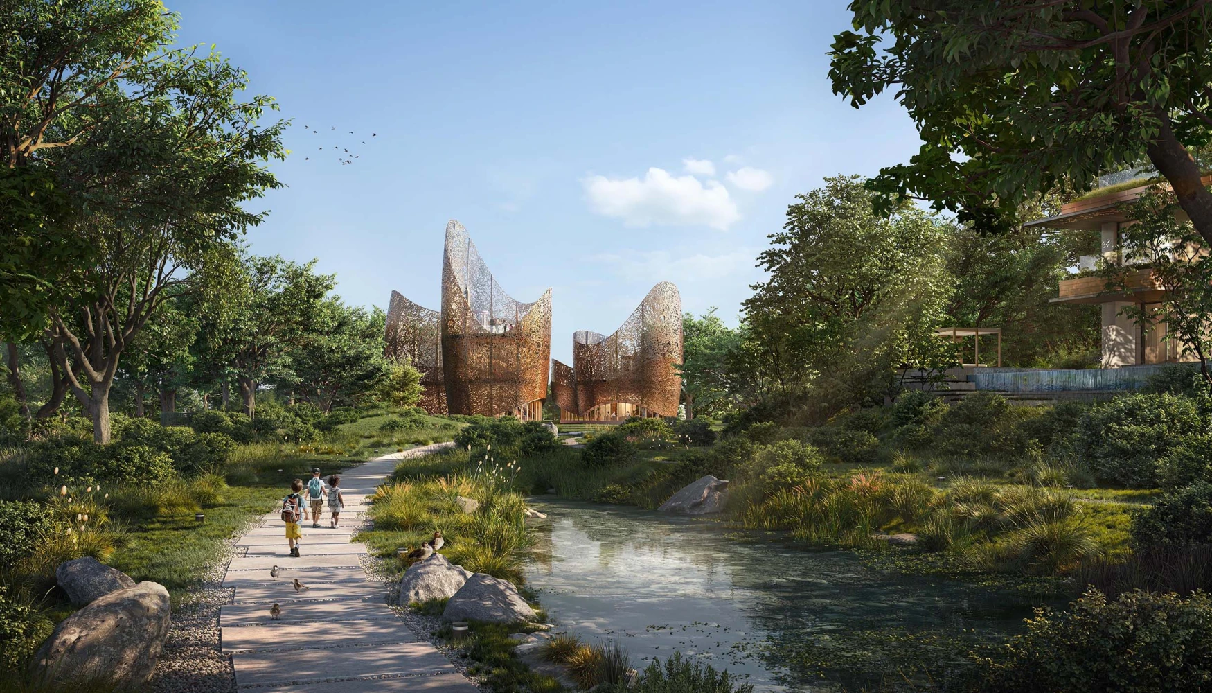 - Central hub: The Nest Signature Pavilion with wildlife observation areas and environmental learning spaces.